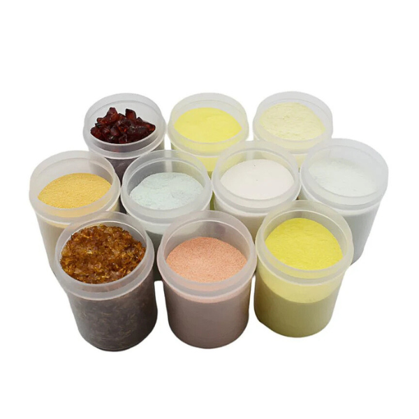 Colours included are: Deep Red Powder 0224.08, Burnt Orange Powder 0329.08, Sunflower Yellow Powder 0220.08, Golden Green Powder 0227.08, French Vanilla Powder 0137.08, Canary Yellow Powder 0120.08, Mint Green Powder 0112.08, Mineral Green Powder 0117.08, Sunset Coral Medium Frit 1305.02, Dark Amber Coarse Frit 1138.03